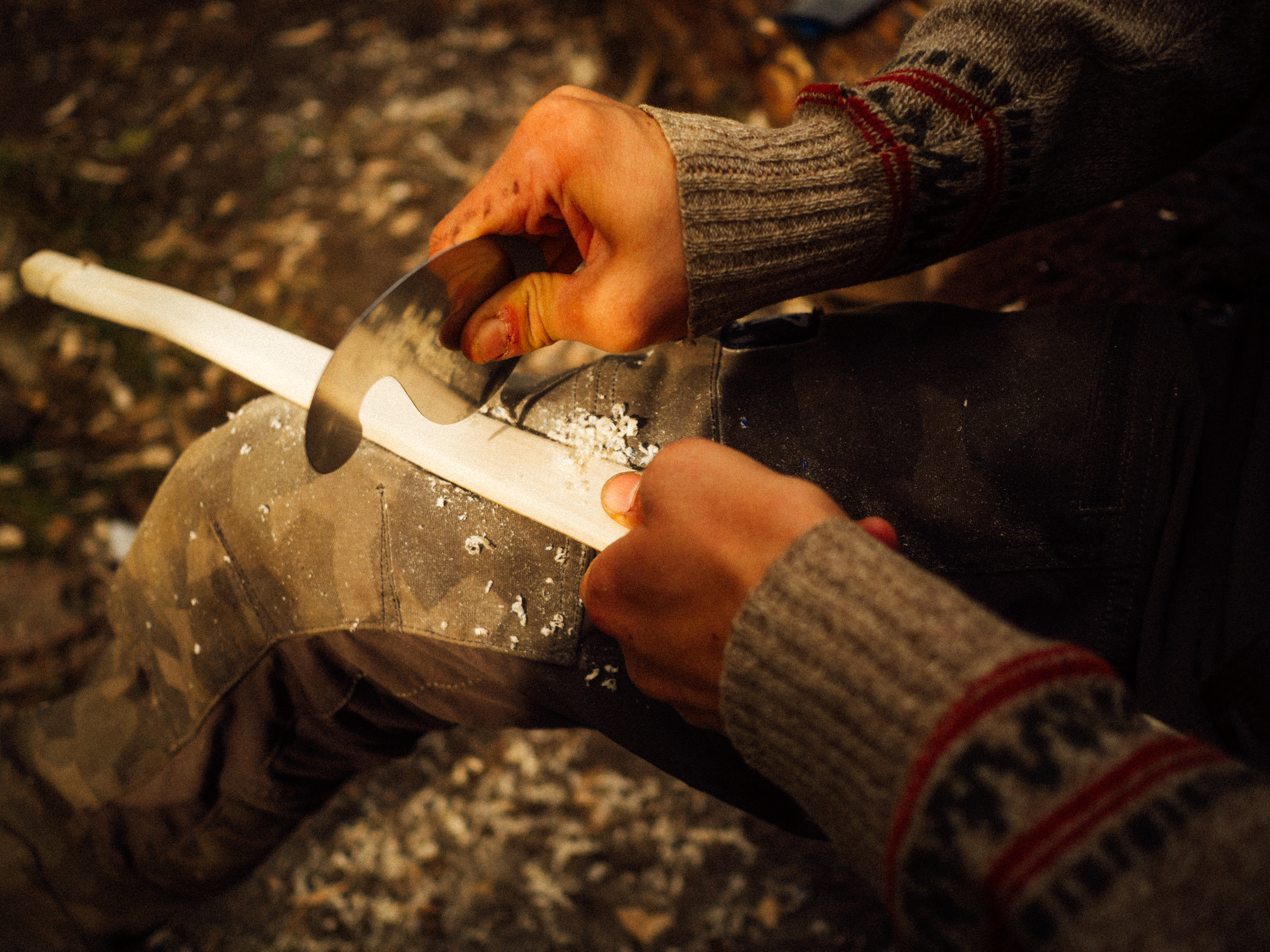 Die Tage verbringen wir unter freiem Himmel – am Feuer, im Gespräch, beim Feilen, Schnitzen, Testen. Übernachtet wird im Zelt oder unter der Plane, mitten in der Natur.
